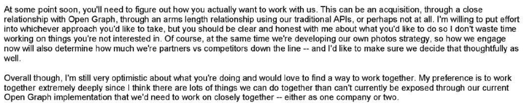Mark opens with honey and a carrot – if you join us, you’d be the Photos guy at Facebook. And of course we’ll leave your precious baby alone. And a gentle reminder, we’re fucking Facebook. We have a lot of firepower.