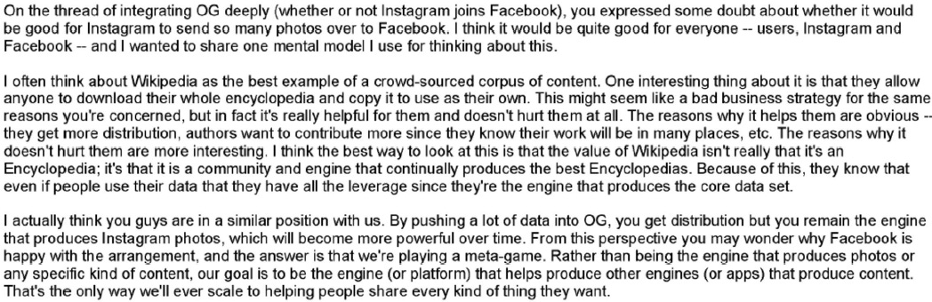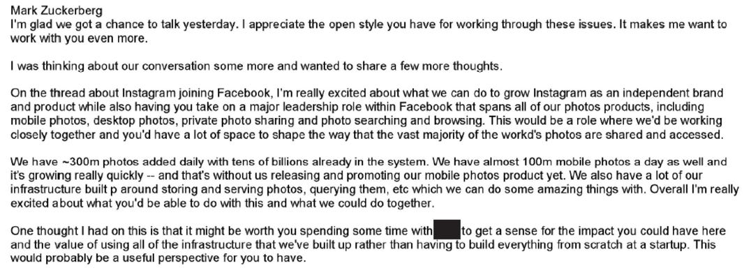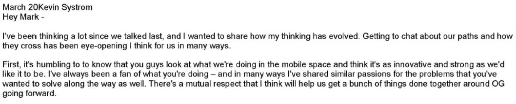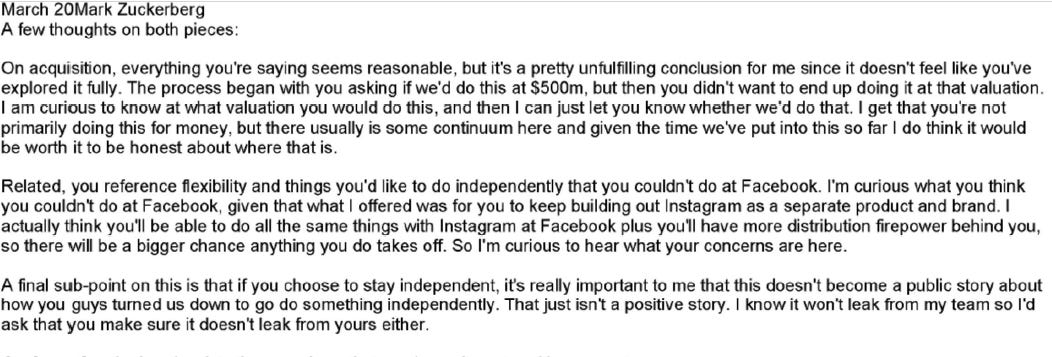 With this context, and to our unbelievable luck, the US House of Representatives antitrust subcommittee made public the emails around the time of the acquisition. The exchanges between Zuckerberg and Krieger offer a fascinating glimpse into their respective mindsets, particularly Zuckerberg’s.